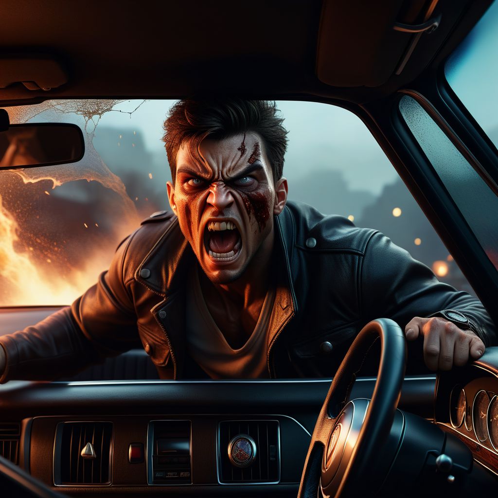 Ultra realistic color pencil image of an extremely angry young man breaking the windshield of a car with a baseball bat. BREAK Deep dark intense brown misty background, Dark theme, dynamic lighting, (soft shadows), (soft focus), (photo realistic), uhd, 8k