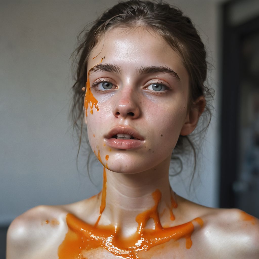 Ultra detailed film photograph with tiny depth of field, shot in an empty studio space with complex lighting. The bare bust of a beautiful woman, her hair and face and slender neck and delicate collarbone and small firm breasts. She looks stoic and severe, soft eyes that are perfectly in focus. Her mouth is overflowing with thick paint, From her lips flows richly orange colored paint, drooling and trickling from her lips down her chin, dripping on her tiny breasts, her erect nipples. trickling down her neck. Everything else slips out of focus. Surreal and artistic.