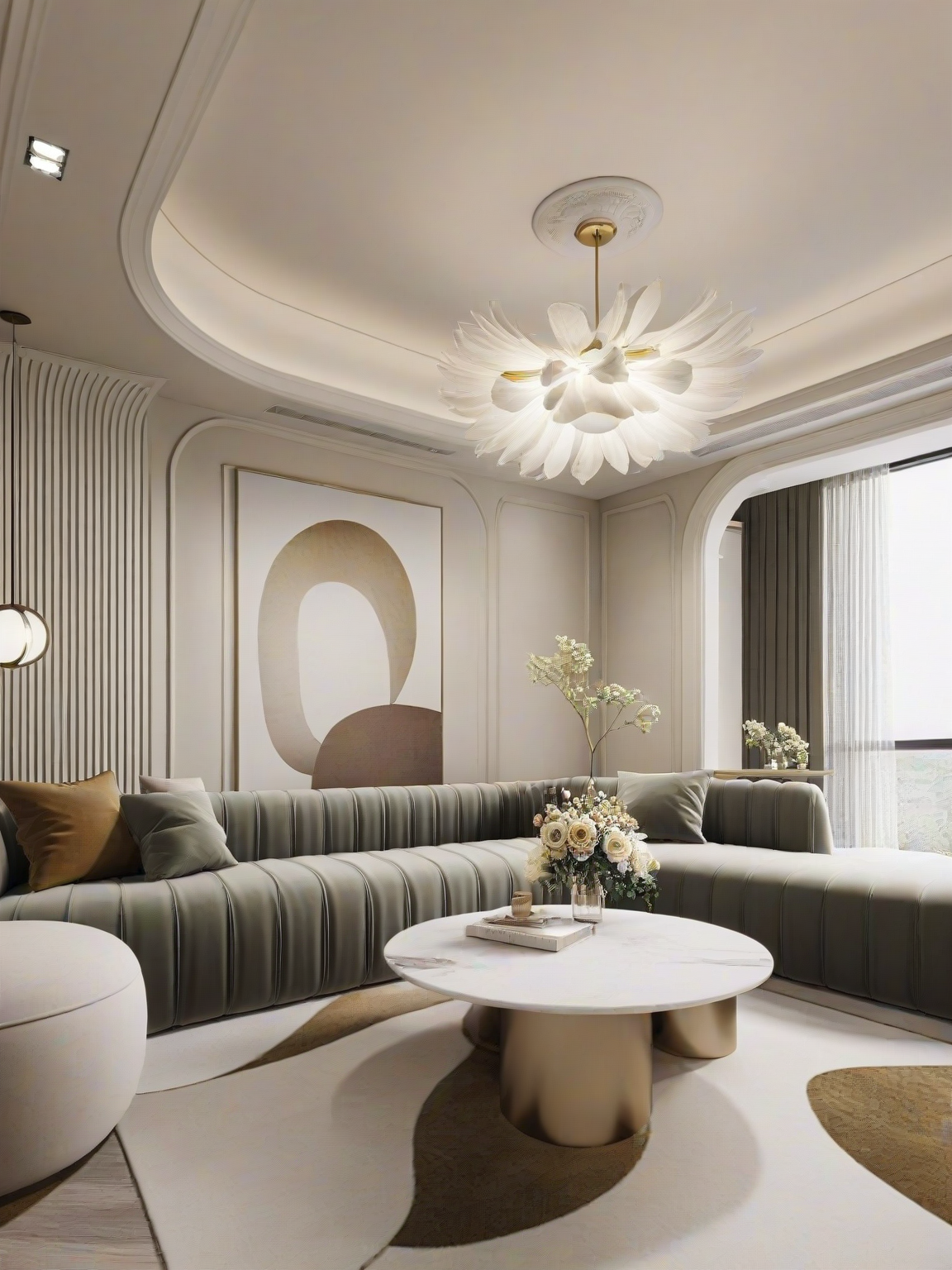 <lora:JJsCreamStyle_XL:1>, ((Cream Style)), ((masterpiece)), ((best quality)), scenery, real world location, realistic, high detailed,, soft lighting, (indoor) , no human, window, sofa, ceiling light, carpet, tv, curtain, coach, table, glass, flower, golden ratio,