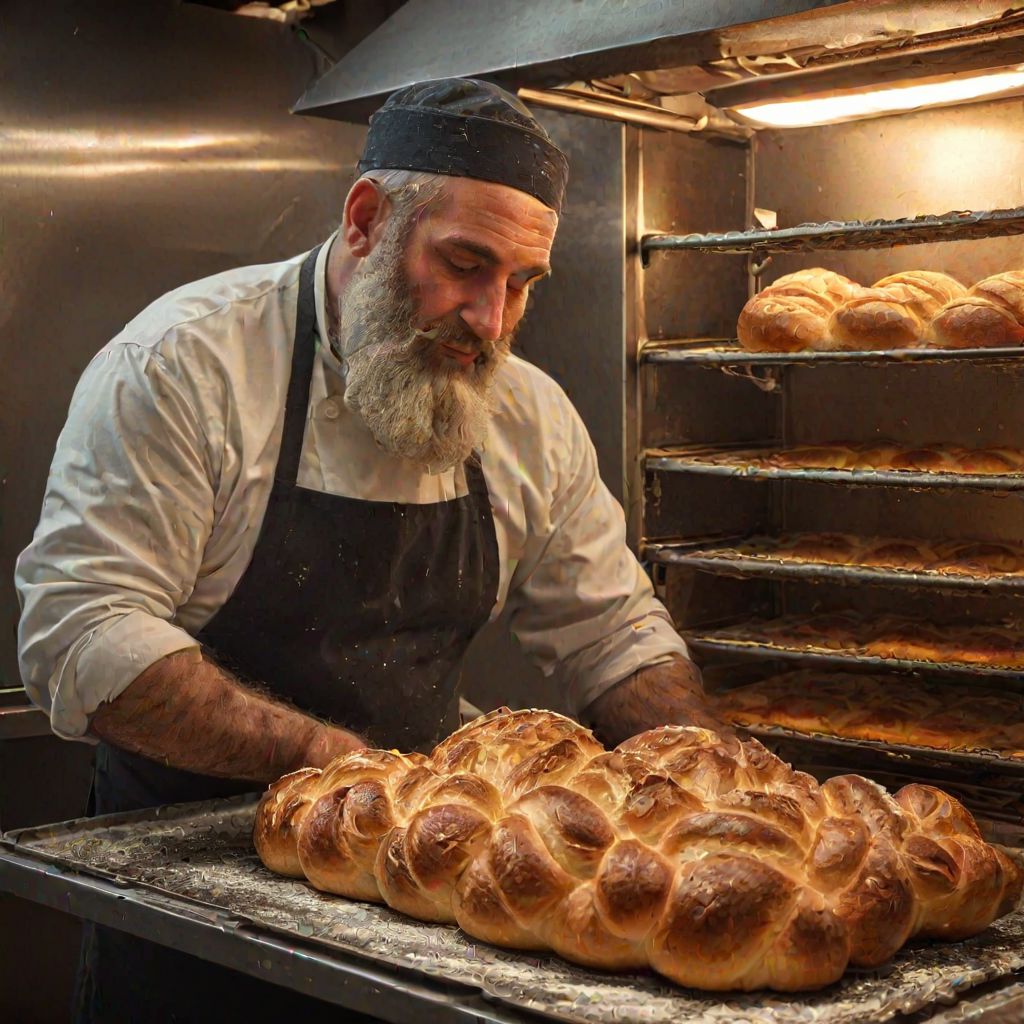 A Jewish guys bake beautiful challah in the oven in a bread bakery in the style of a digital paintingdigital painting stylel painting style,highly detailed, vibrant, production cinematic character render, hyper-realistic high-quality model, HDR,3d, 8K, ultra high quality. Digital Art by AlPacifista