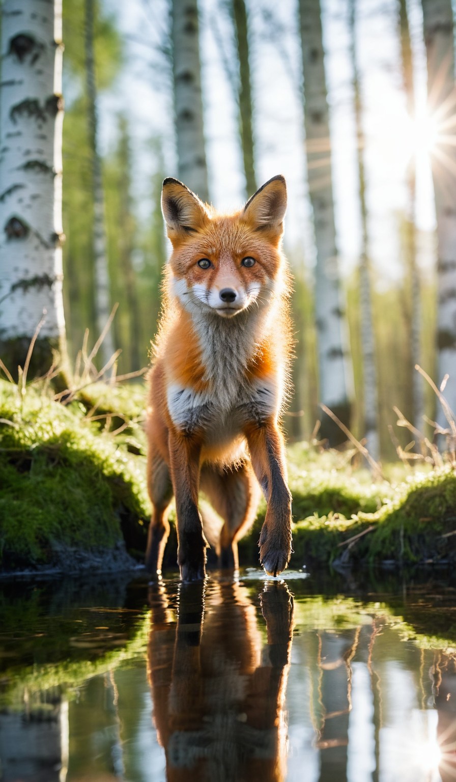 Low angle close-up of a jumping young fox in lush green spring birch forest shot against rising sun with lensflare and reflections in crystal clear water, cinematic look, film, breathtaking photograph, award-winning, professional, dlsr, dramatic light, highly detailed . 35mm photograph, 4k, vivid colors, daylight, warm atmosphere, focus stacking, shot on hasselblad, <lora:add-detail-xl:1>, <lora:SDXLHighDetail:0.5>