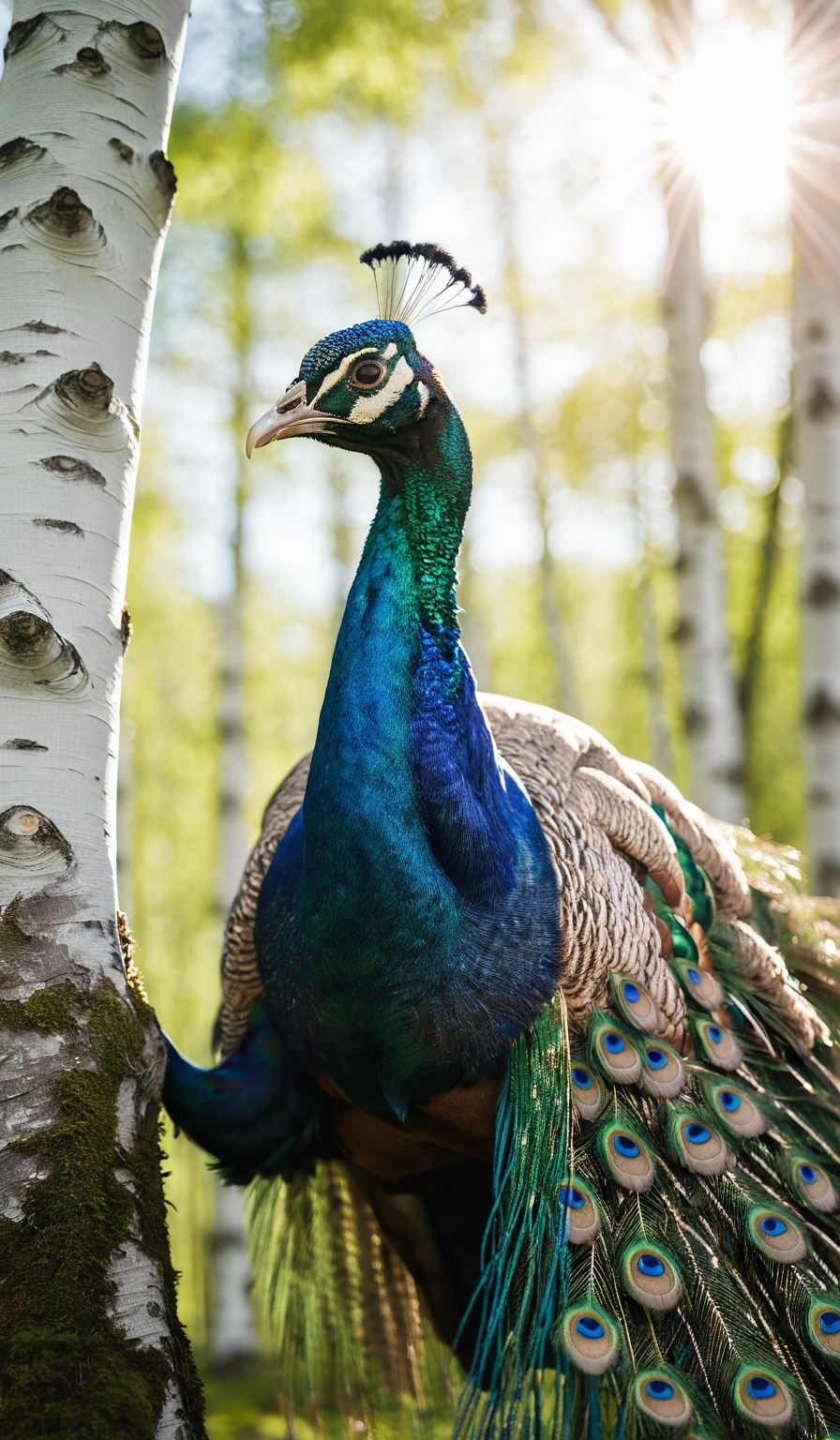 Low angle close-up of a peacock with open feathers in lush green spring birch forest shot against rising sun with lensflare and reflections in crystal clear water, cinematic look, film, breathtaking photograph, award-winning, professional, dlsr, dramatic light, highly detailed . 35mm photograph, 4k, vivid colors, daylight, warm atmosphere, focus stacking, shot on hasselblad, <lora:add-detail-xl:1>, <lora:SDXLHighDetail:0.5>