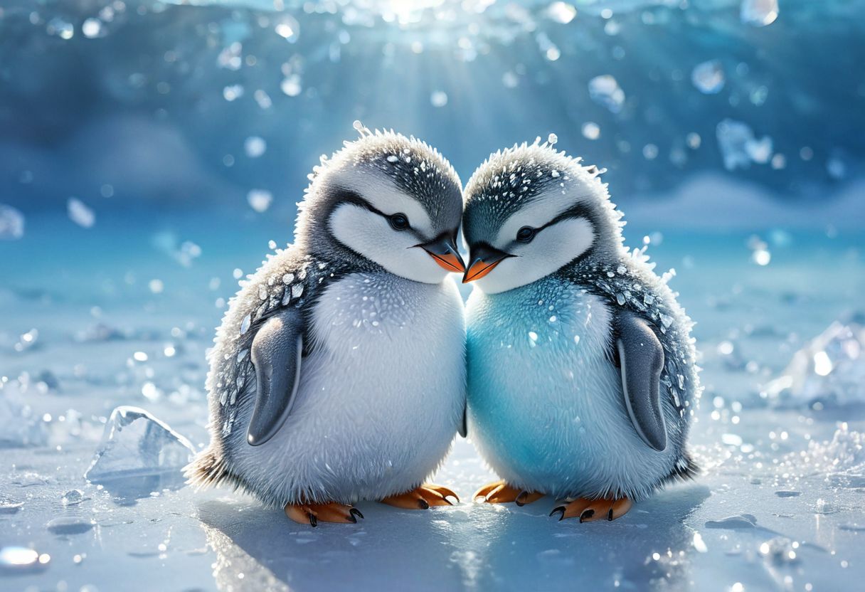 two adorable chibi penguins hugging on the ice, snowy icy artic background, Broken Glass effect, no background, stunning, something that even doesn't exist, mythical being, energy, molecular, textures, iridescent and luminescent scales, breathtaking beauty, pure perfection, divine presence, unforgettable, impressive, breathtaking beauty, Volumetric light, auras, rays, vivid colors reflects