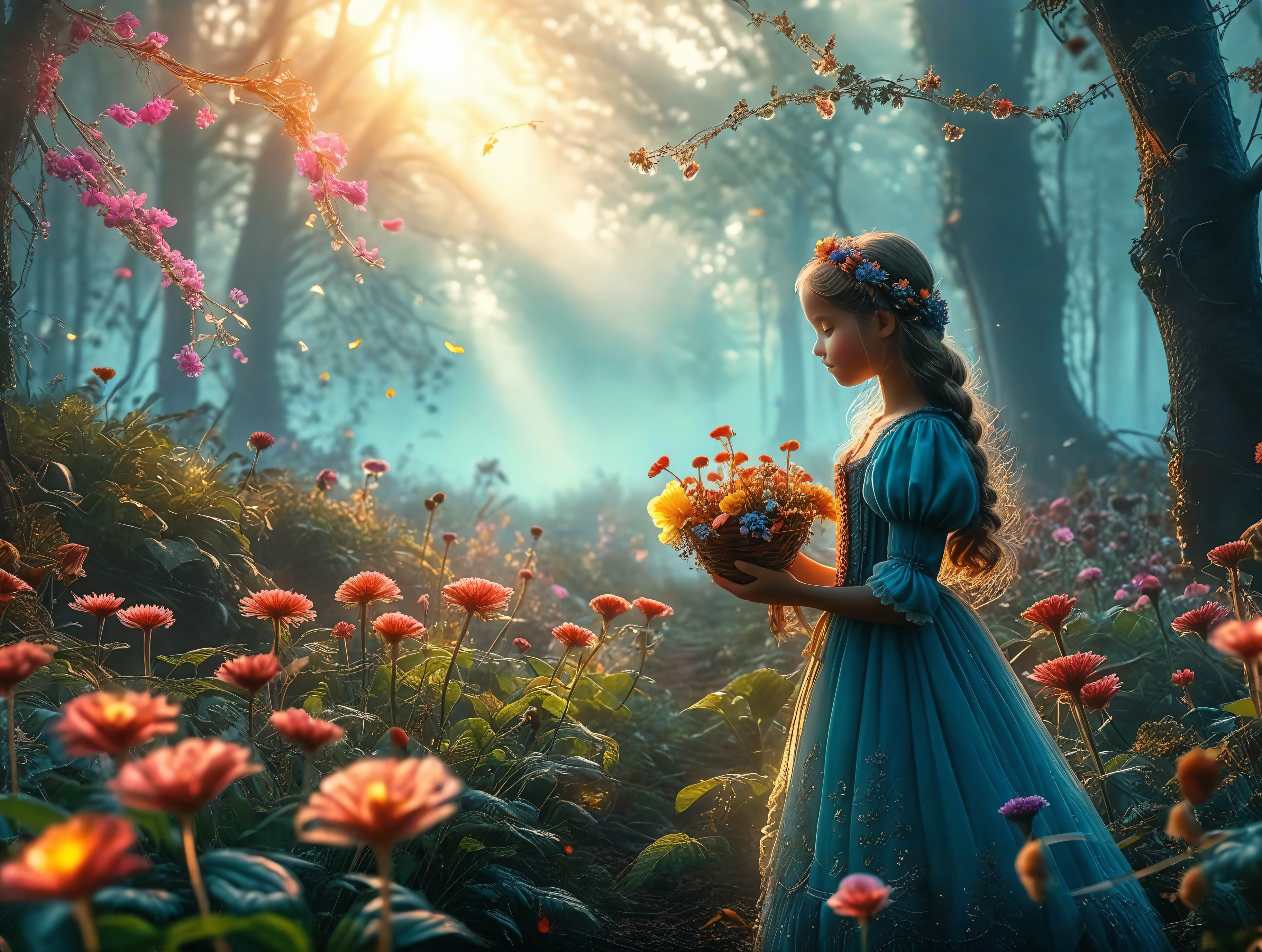 Fairy tale Magical forest, magic sunrise, foggy, girl harvesting magic flowers, 8k, intricate details <lora:add-detail-xl:1> <lora:MJ52:0.6> . Magical, fantastical, enchanting, storybook style, highly detailed