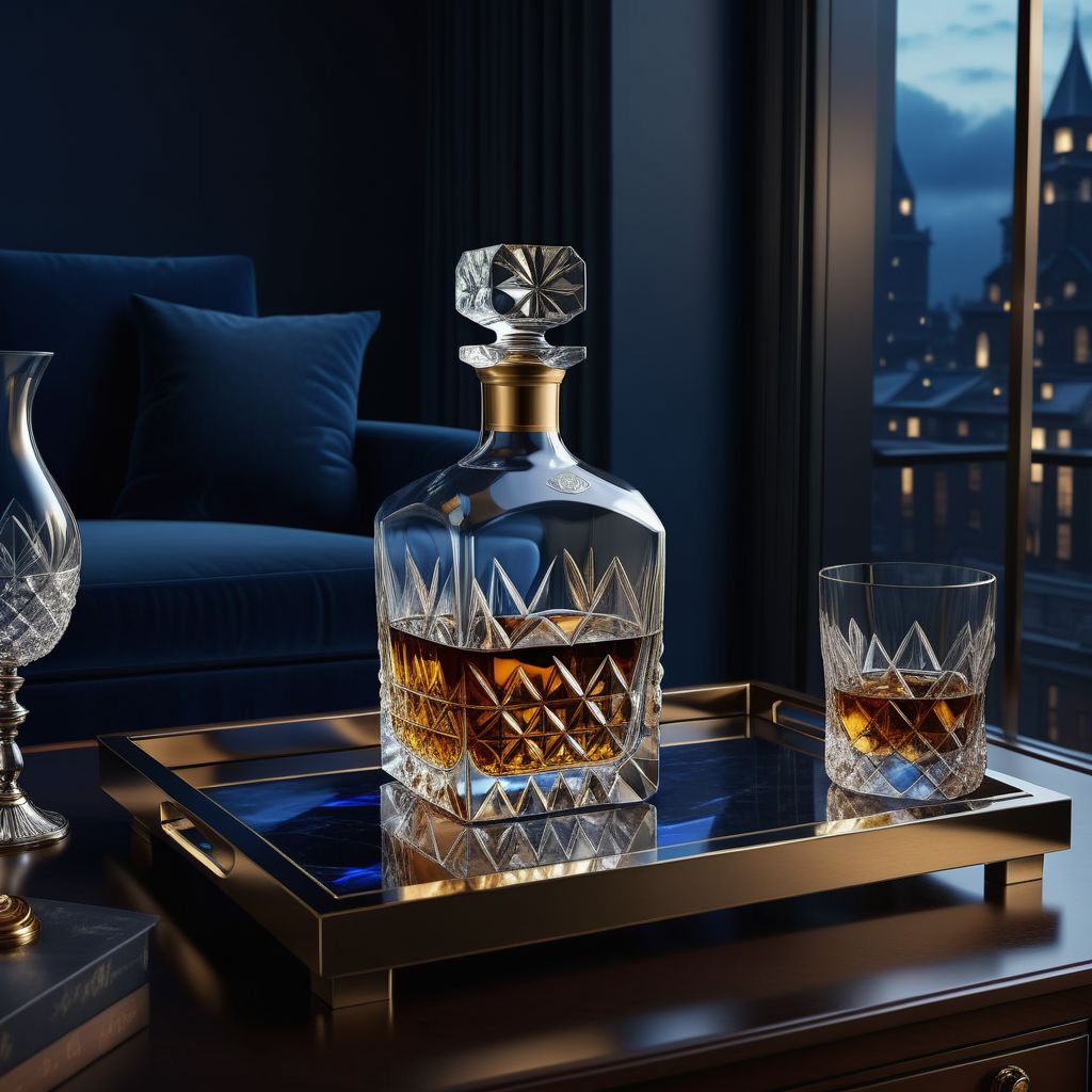 Ultra realistic full body color pencil drawn portrait of whisky .in a crystal carafe on a drinks tray in a luxurious penthouse apartment. BREAK Deep dark intense midnight blue misty background, Dark theme, dynamic lighting, (soft shadows), (soft focus), (photo realistic), uhd, 8k