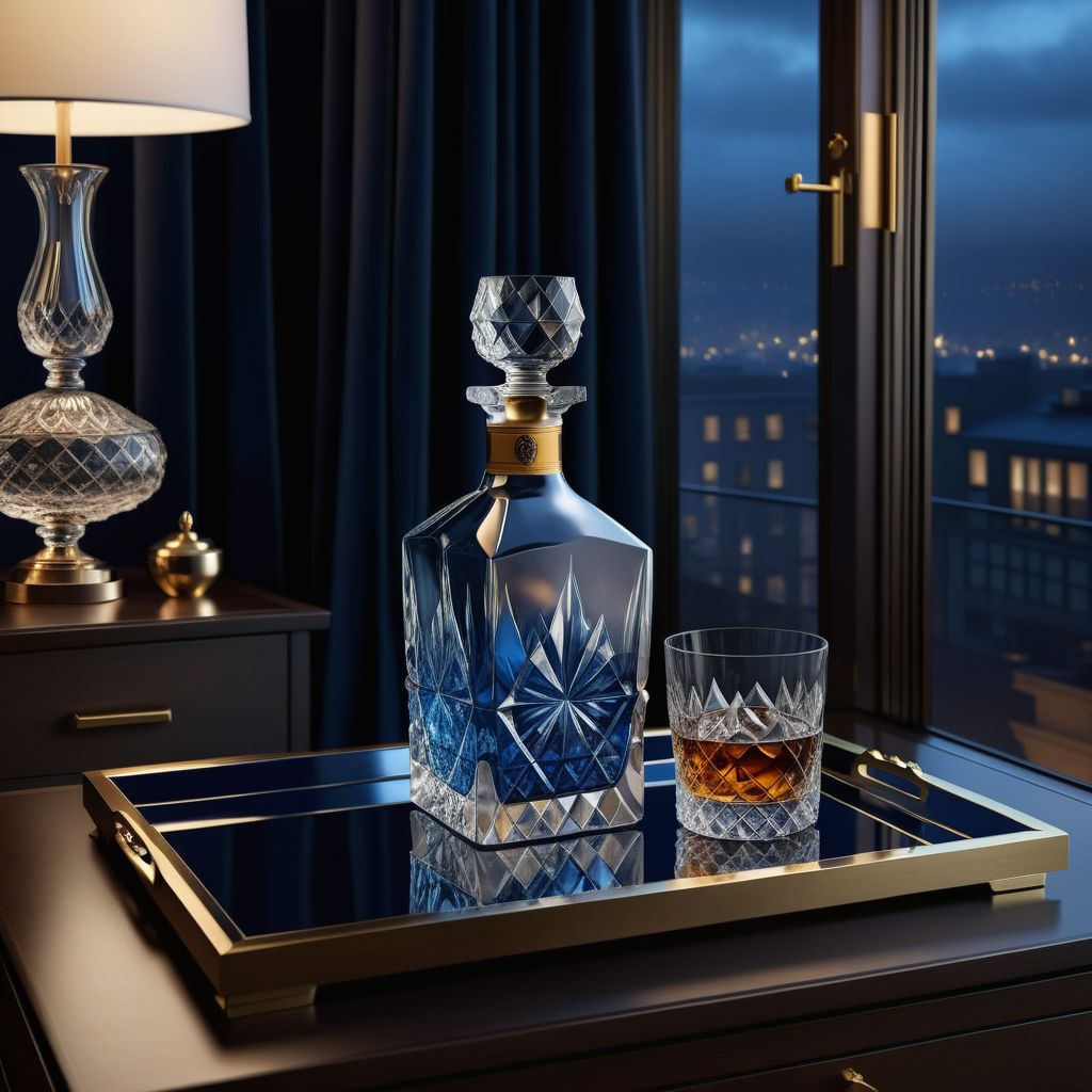 Ultra realistic full body color pencil drawn portrait of whisky .in a crystal carafe on a drinks tray in a luxurious penthouse apartment. BREAK Deep dark intense midnight blue misty background, Dark theme, dynamic lighting, (soft shadows), (soft focus), (photo realistic), uhd, 8k