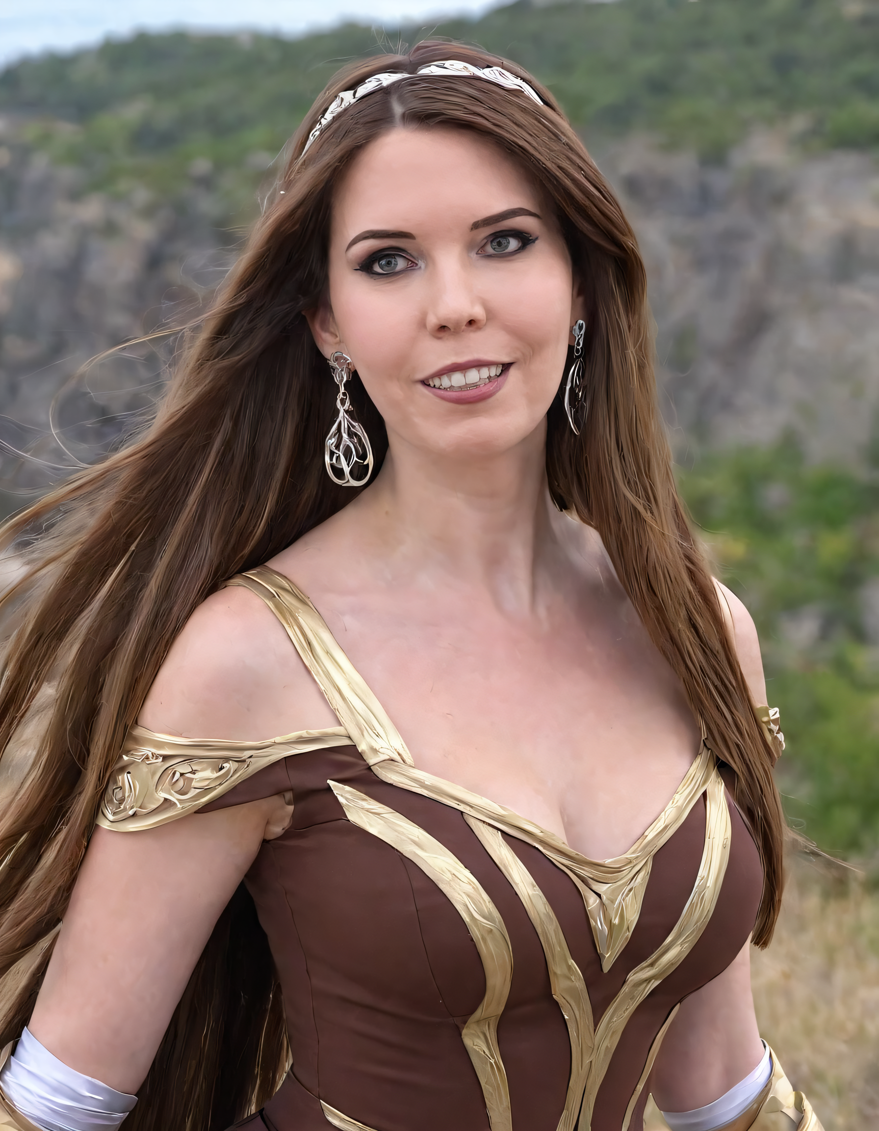 KamuiCosplay, dressed stylishly in her latest costume, stood elegantly amidst the serene landscape, her long brown hair billowing gently with the breeze as she gazed directly into the camera lens, a glimmer of excitement and confidence shining through her eyes, accessorized with intricate earrings that effortlessly complemented both her attire and the stunning backdrop, making each and every solo moment a captivating visual spectacle. <lora:uipmwl18e923679f6wad:1>