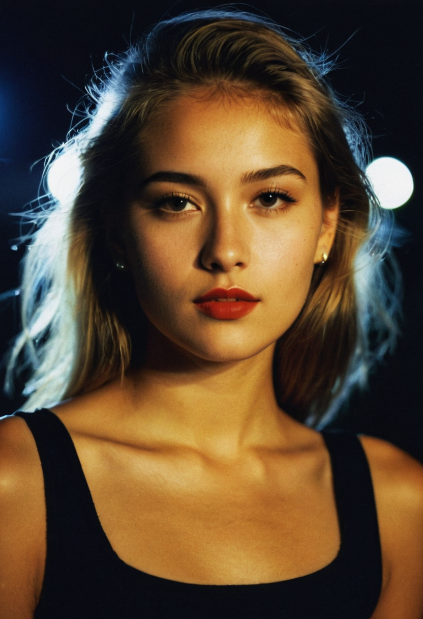 raw photo,half body, 1girl, 25 y.o. , 90's style, night, high contrast, hard light, griny photo