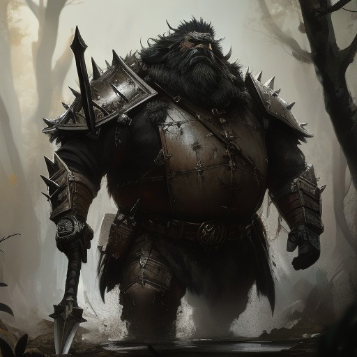 evang, A rugged and grizzled leader of a troll army holding a battle ax walking through a forest, spiked armor shoulder guards and a animal pelts coat, Extremely detailed concept art , ((masterpiece)) Greg Rutkowski, Krenz Cushart Artstation style Artstation