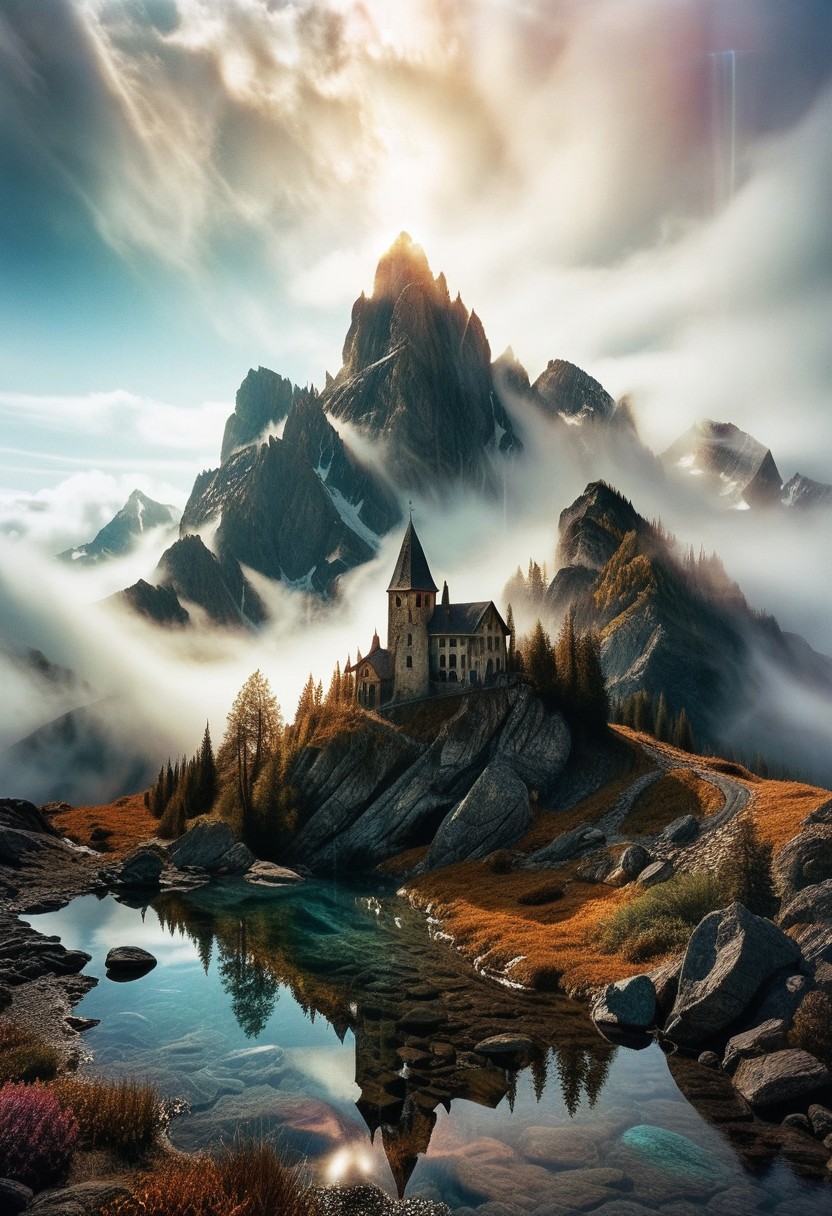 their peaks veiled in mist. mixed media, surrealism, great lighting, A surreal landscape highly detailed . extremely high-resolution details, appears trapped in an optical illusion of reflections and refractions colorful , professional photography, natural lighting, GhostlyStyle, volumetric lighting maximalist. intricately detailed, complex, elegant, expansive, fantastical, film photography style, medium grain, lthndrtrl