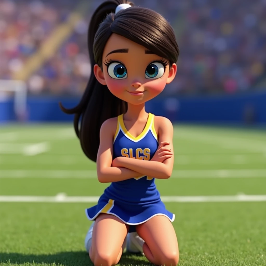 Disney Pixar 3d animated movie character. Brunette woman cheerleader with big blue eyes. Blue and gold cheerleader uniform has the letters SLCS on the front. The background has a football stadium. She is kneeling on the grass.