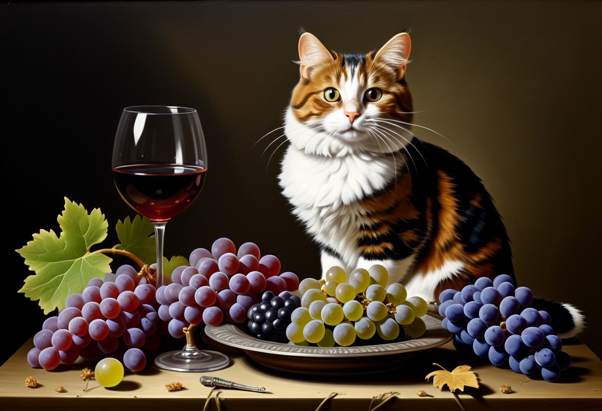 a Still life naturmorte withs grapeand a glass of wine in the style the 17th century of the "little Dutch" Breack ( A small bird is sitting on a grape, and a cat's head is visible from the edge of the canvas, ready to jump.:1.4) Breack High quality. High detail, sophisticated professional lighting,grape brush