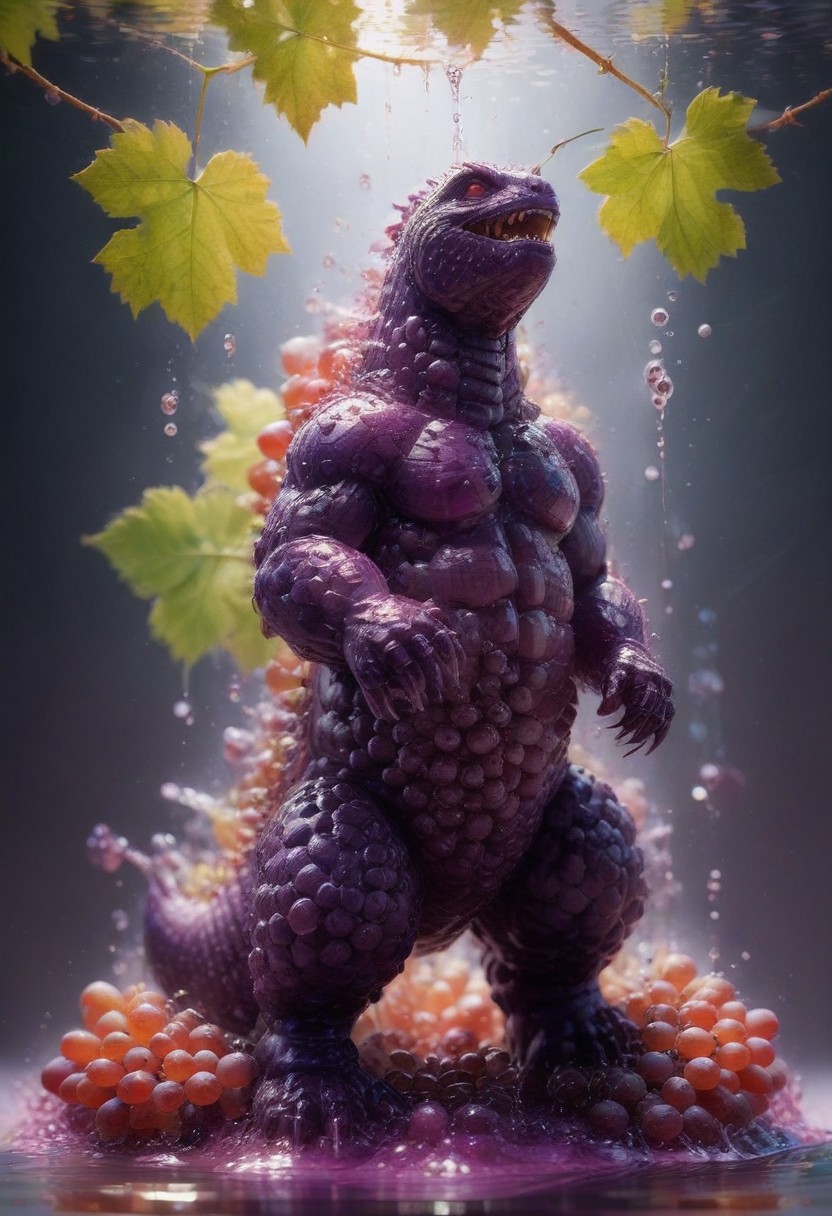 Ultrarealistic. sharp focus, dynamic lighting. play of light, reflection, refraction, Raytracing, Ultra detailed. Gigantic Godzilla made of brown grapes in a city.