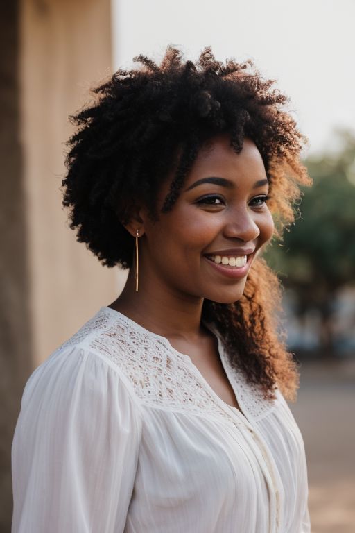 <lora:ATKKatja:0.8>, full color portrait of a african woman, wearing a blouse, shy smile, natural light, RAW photo, subject, 8k uhd, dslr, soft lighting, high quality, film grain, Fujifilm XT3
