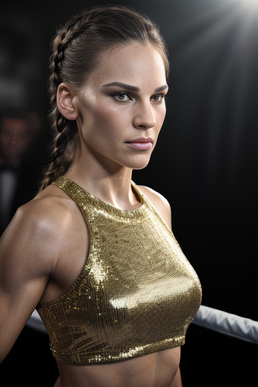 (RAW, analogue, Nikon Z 14mm ultra-wide angle lens, award-winning glamour photograph, ((best quality)), ((masterpiece)), ((realistic)), skin pores, subsurface scattering, radiant light rays, high-res, detailed facial features, high detail, sharp focus, smooth, aesthetic, extremely detailed, (extremely detailed eyes, extremely detailed iris), extremely detailed hair, extremely detailed skin, extremely detailed clothes, octane render, photorealistic, realistic, post-processing, max detail, realistic shadows, roughness, natural skin texture, real life, ultra-realistic, photorealism, photography, 8k UHD, photography, hdr, intricate, elegant, highly detailed, sharp focus, stunning, beautiful, gorgeous), (photorealistic), (realistic), hi14ry5w4nk wearing boxing gloves, boxing pose, stern expression, sports bra, boxing trunks, standing in a boxing ring, full body, short brown hair, tight braid, brown eyes, indoors, arena, crowd, upper body, dimly lit, photorealistic, realistic, detailed eyes, intricate face, high contrast, <lora:Hilary_Swank_PMv1a_Lora:1.3>,