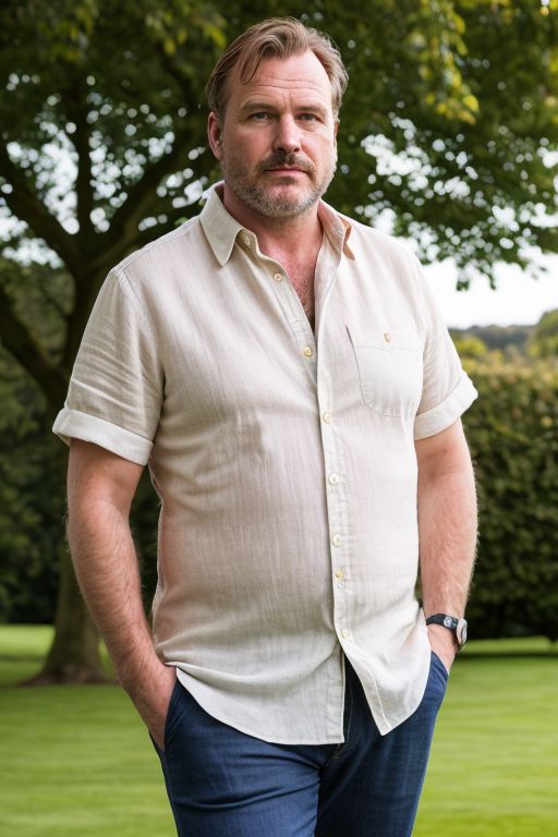 Handsome middle-aged british man,dadbod,beefy, in an old english estate, saltburn,linen shirt,(groomed:0.5),rolled-up sleeves,casual sophistication,tousled hair,wristwatch accent,(laid-back charisma:0.7),perfect lighting,perfect shading,<lora:AdvancedEnhancer:1>,<lora:xl_more_art-full_v1:1>,