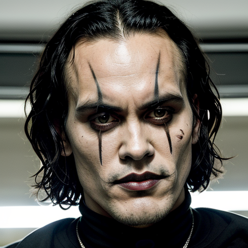 a portrait of Eric_Draven_512v2-900, (black and white make up:1.25), (creepy look on his face:1.1)