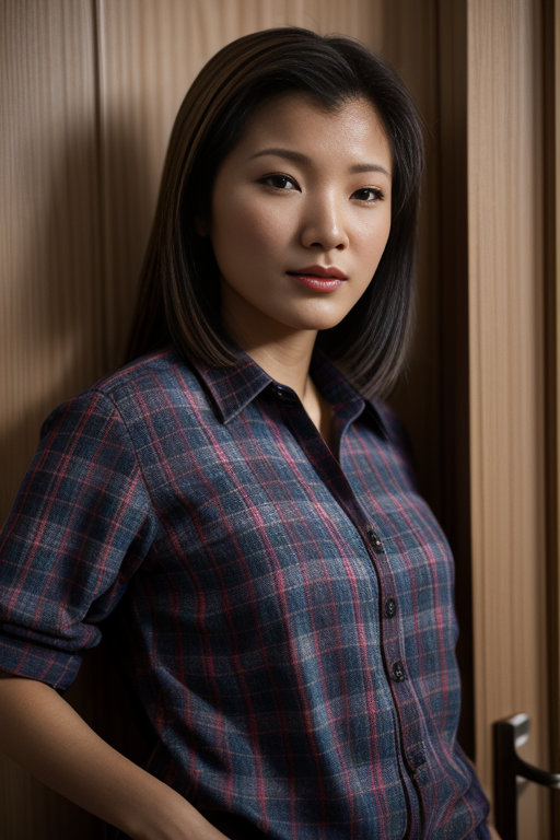 k311yhu in a plaid top and is standing in a doorway with her hand on her hip, <lora:Kelly_Hu_PMv1_Lora:1.3>,, ((Close-Up)), high quality photography, 3 point lighting, flash with softbox, 4k, Canon EOS R3, hdr, smooth, sharp focus, high resolution, award winning photo, 80mm, f2.8, bokeh, detailed skin texture, (blush:0.5), (goosebumps:0.5), subsurface scattering