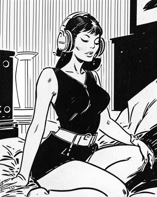 <lora:carlosgimenez:1> gimenez black and white drawing a ((tilted)) angle close, dynamic angle, beautiful woman, demure, , voluptuous, sitting wearing big headphones, listening to music, eyes closed, meditating, vintage vinyl, record player on bed