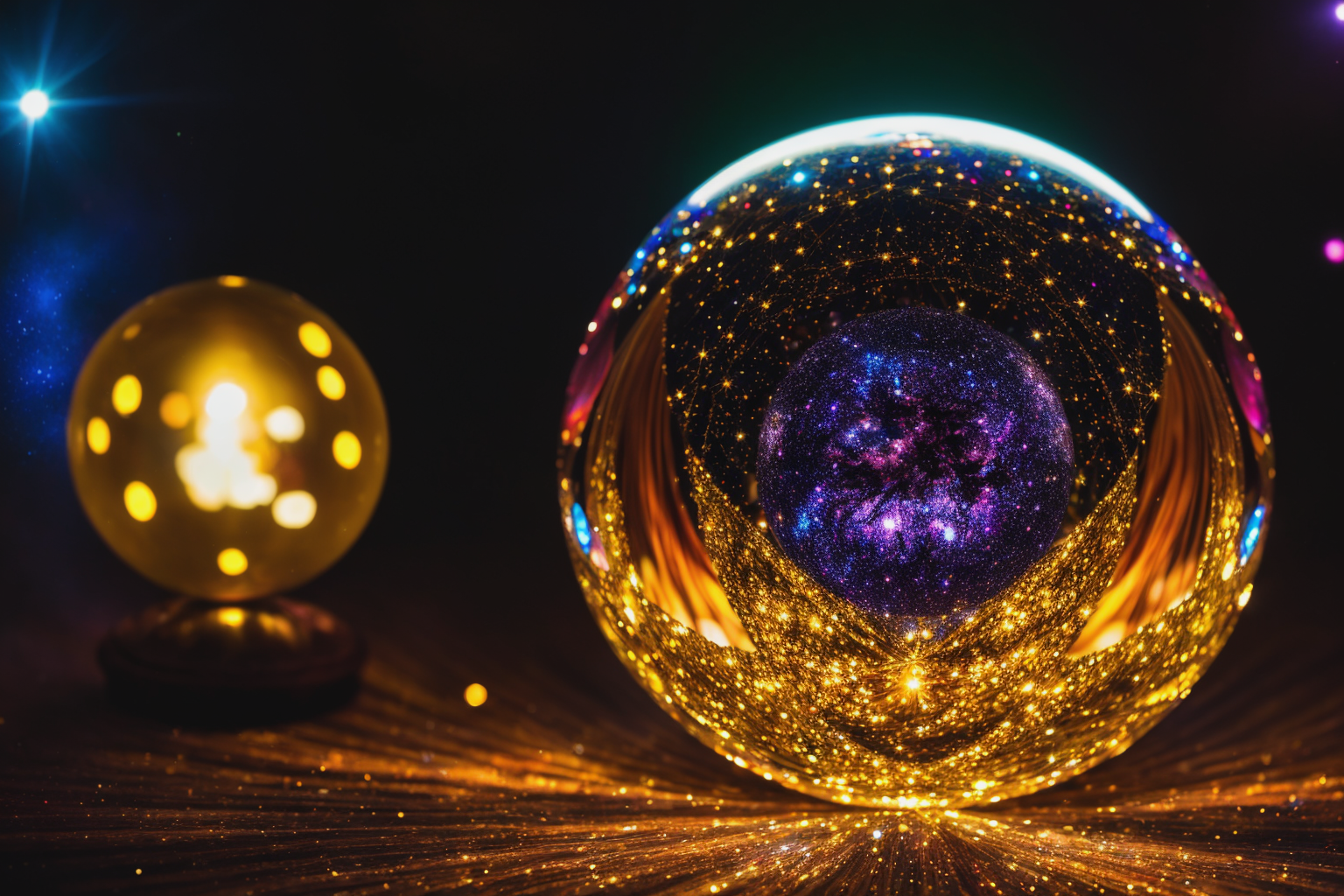 masterpiece, best quality, sparkling crystal ball, (multiverse:1.2), stars, galaxy, magic, cinematic, intricate details, vivid color, dark room,