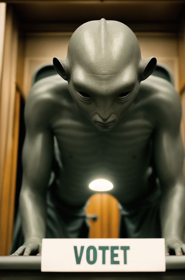 cinematic screenshot of a typical roswell grey alien pointing at the camera, kentucky court house, voting booth, masterpiece, best quality, highly detailed, professional color grading, film grain, atmosphere, wondrous, 8k resolution, hyper realistic,