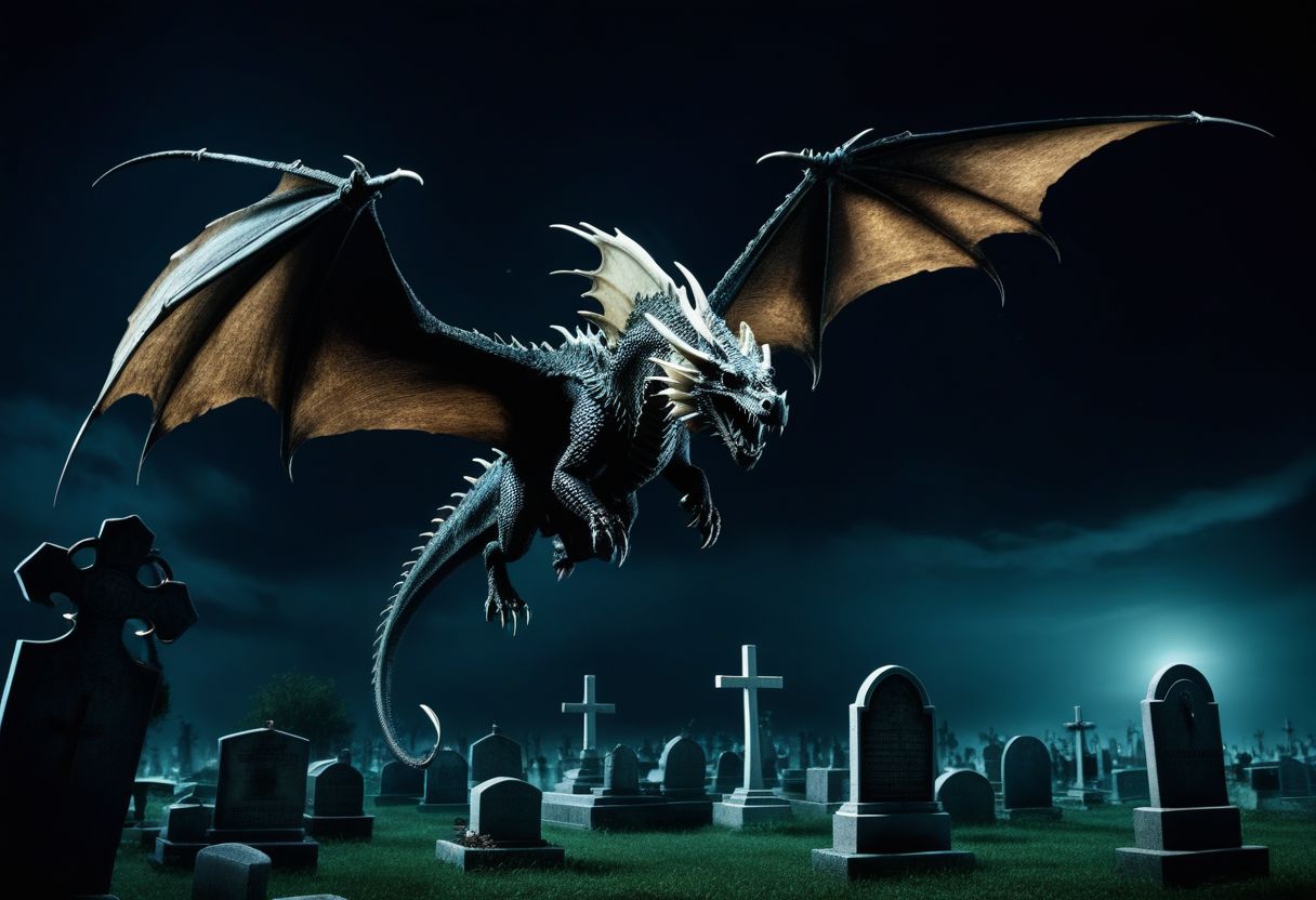 a bone dragon flying over a cemetery, cemetery, at night, darkness, dark fantasy