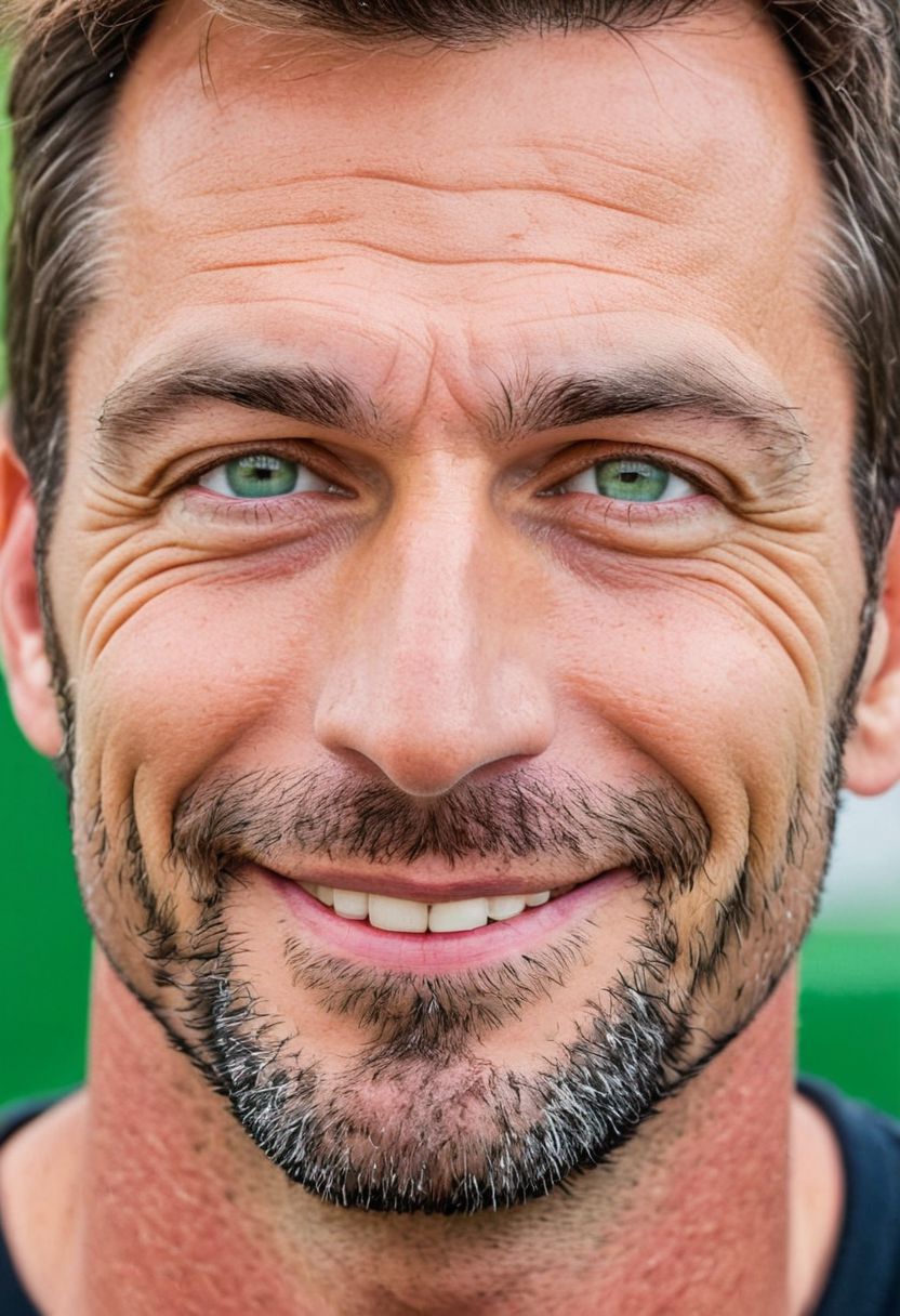 man, male, AndrwTggrt, face shot, 42 years old, looking at viewer, handsome, beautiful, attractive, green eyes, brown hair, smile, eyebrow's piercing