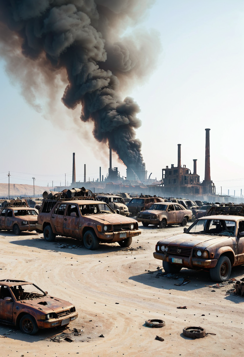 A decrepit human settlement on a barren desert plain, surrounded by makeshift walls of scrap metal and decaying vehicles, smoke billowing from industrial chimneys in the background, evi@decrepPunk atmosphere, detailed textures <lora:evidecrepPunk:0.8>