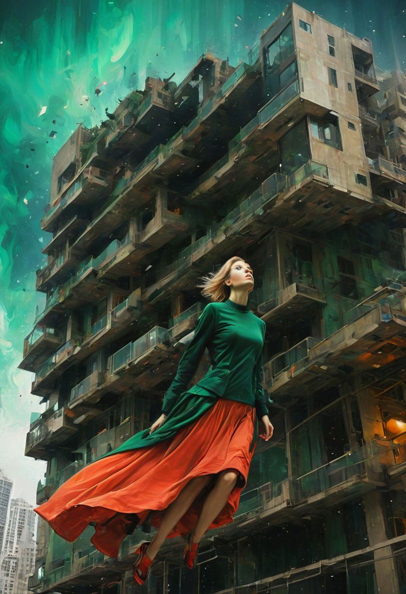 by Dom Qwek and Denys Lasdun, (magnificent , Abstract Expressionism but extremely beautiful:1.4), (intricate details, masterpiece, best quality:1.4) , view from below, woman with flowing skirts flying between buildings, levitating, clothes like midnight full of stars, Cyberpunk style, neon, dystopian, futuristic, digital, vibrant, detailed, high contrast, reminiscent of cyberpunk genre, , looking at viewer, dynamic pose, red and petrol green hue <lora:add-detail-xl:1> <lora:xl_more_art-full_v1:0.5> <lora:NicolaSamori:0.5> in the style of nicola samori <lora:looking_at_viewer:2>