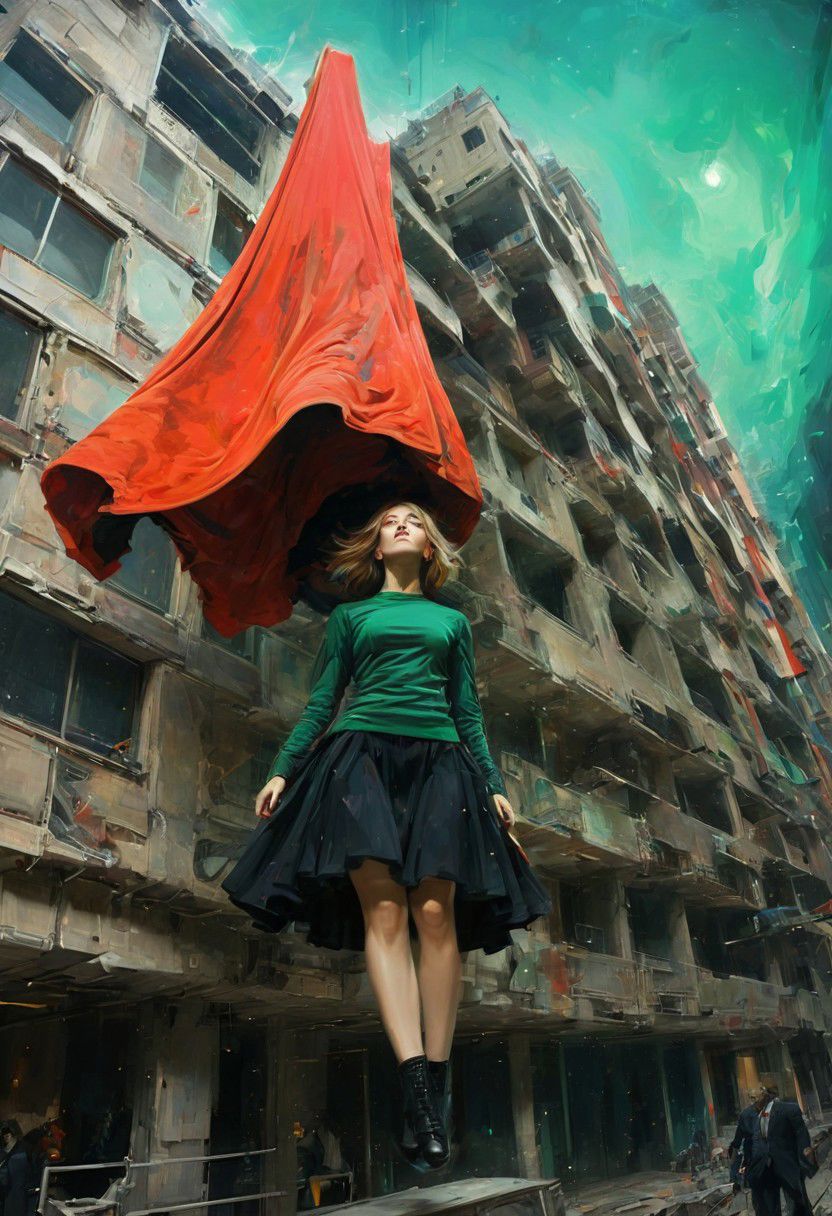 by Dom Qwek and Denys Lasdun, (magnificent , Abstract Expressionism but extremely beautiful:1.4), (intricate details, masterpiece, best quality:1.4) , view from below, woman with flowing skirts flying between buildings, levitating, clothes like midnight full of stars, Cyberpunk style, neon, dystopian, futuristic, digital, vibrant, detailed, high contrast, reminiscent of cyberpunk genre, , looking at viewer, dynamic pose, red and petrol green hue <lora:add-detail-xl:1> <lora:xl_more_art-full_v1:0.5> <lora:NicolaSamori:0.5> in the style of nicola samori <lora:looking_at_viewer:2>