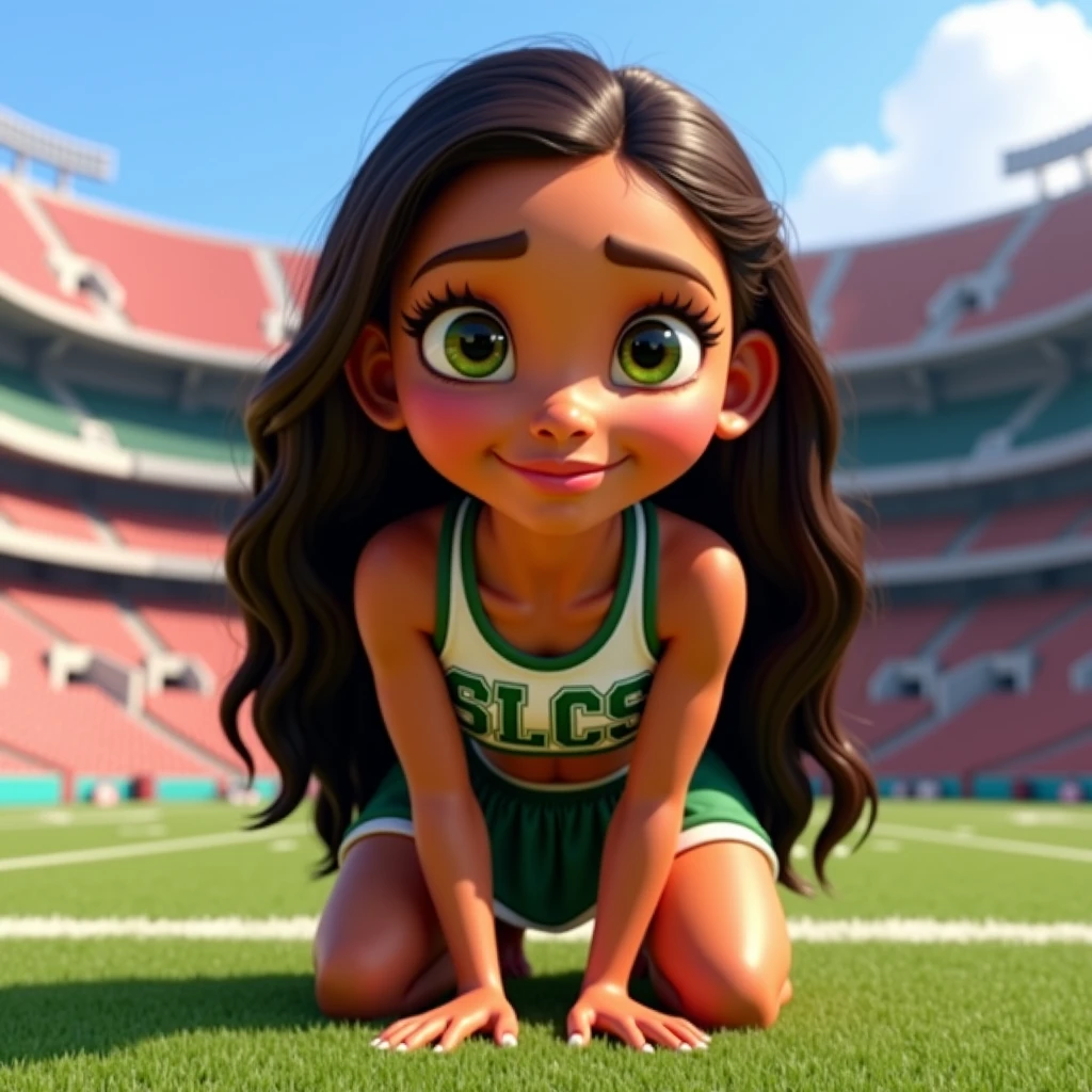 Disney Pixar 3d animated movie character. Beautiful brunette woman cheerleader with big green eyes. Cheer uniform has the letters SLCS on the front. Gorgeous brown Moana hair. The background has a football stadium. She is kneeling on the grass.