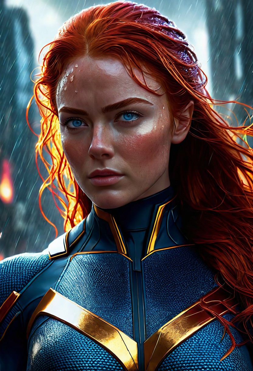 Ultra detailed digital art masterpiece, Hyperdetailed, hyperrealism, extremely high resolution of Beautiful Jean Grey, Greg Rutkowski, Intricately Designed Handsome face, Realistic blue eyes, wavy long red hair, Marvel, Intricately Designed X-Men costume, 8K, deep color, Cinematic Lighting, intricate smooth, sharp focus digital painting, Artgerm, WLOP, Greg Rutkowski, Beautiful Sadie Sink as Jean Grey, wavy red hair, handsome freckled face, Marvel comics, Realistic combat dirty clothing, perfect whole athletic body, defiant and seductive, Photograph Taken on Nikon D750, Intricate Elegant, Digital Illustration, Scenic, Unreal Engine, CryEngine, Octane Render, 8k, standing in the runes of a metropolis, Designed combat clothes, Attractive, Attractive woman, dramatic lighting, wet and sweaty skin, beautiful firm Breasts, Daylight, Concept art by Greg Rutkowski, adding to the intense and dynamic atmosphere of the scene
