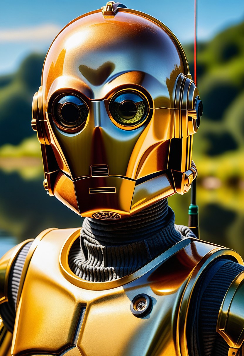 Centered, Incredibly Detailed Accurate Picture Of C-3PO Fly-Fishing, close-up portrait, shallow depth of field, warm color grading, Oil painting, linkedin portrait, by Aaron Garbut, by Gustave Courbet, by Jules Breton, close up, natural beauty