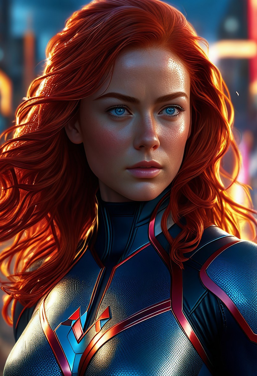 Ultra detailed digital art masterpiece, Hyperdetailed, hyperrealism, extremely high resolution of Beautiful Jean Grey, Greg Rutkowski style, standing in the runes of a metropolis, Realistic blue eyes, wavy long red hair, Marvel, X-Men, Intricately Designed X-Men costume, 8K, deep color, Cinematic Lighting, intricate smooth, sharp focus digital painting, Artgerm, WLOP, Greg Rutkowski, Beautiful Sadie Sink as Jean Grey, wavy red hair, Intricately Designed handsome freckled face, Marvel comics, Realistic combat dirty clothing, perfect whole athletic body, defiant and seductive, Photograph Taken on Nikon D750, Intricate Elegant, Digital Illustration, Scenic, Unreal Engine, CryEngine, Octane Render, 8k, Designed combat clothes, Attractive, Attractive woman, dramatic lighting, wet and sweaty skin, beautiful firm Breasts, Daylight, Concept art by Greg Rutkowski, adding to the intense and dynamic atmosphere of the scene
