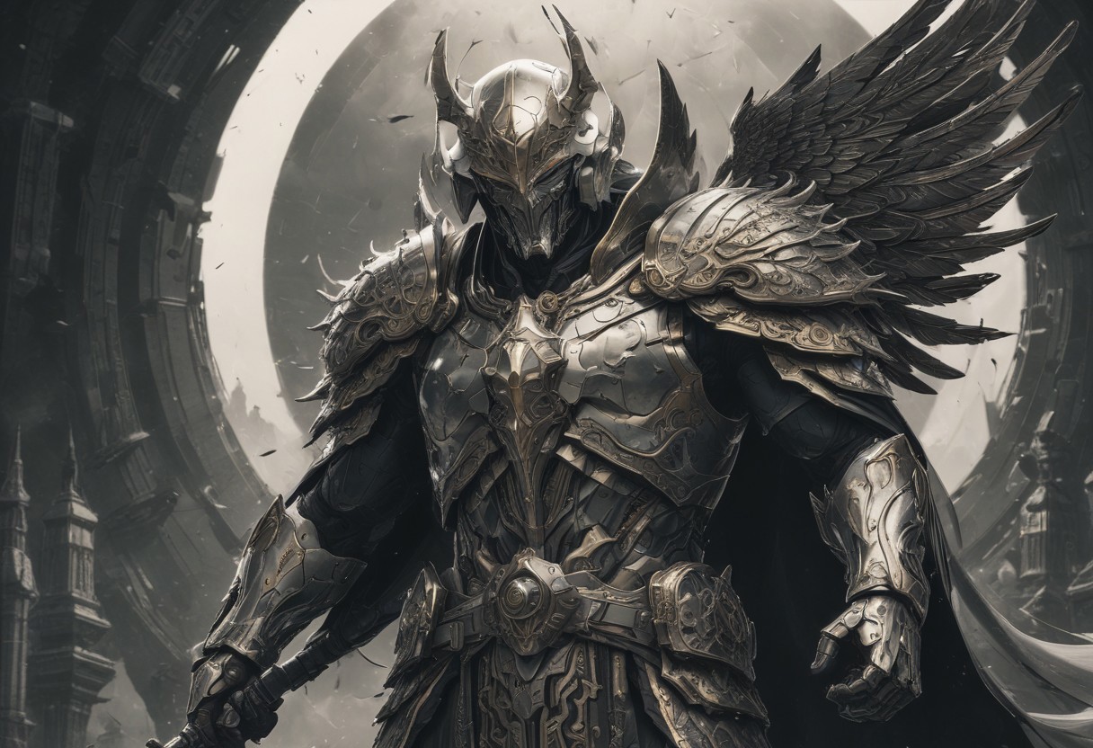 Generate a detailed, 8K HD digital illustration of a grand master, emperor of mankind, depicted as a horrible archangel in evoker robes, wielding a sword and exuding grimdark vibes. Incorporate a black and gold color palette, with lifelike details and a phoenix-inspired design element. Include a huge black circle in the composition, and aim for a style reminiscent of Artgerm, Makoto Shinkai, and Ilya Kuvshinov. Ensure the character's expression is confident and imposing, with a sense of familiarity. Output a dark-toned product photo-style image with super detailed textures and intricate design elements.