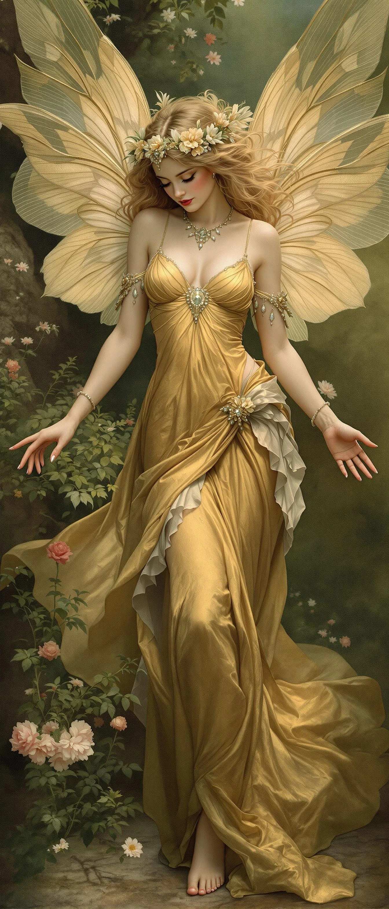 a stunning faerie dressed in the finest silks, she has delicate wings with exquisite detail, there is a dreamy effect to the image, Style of William Zorach, Style of Bunny Yeager,Style of George Frederic Watts, Style of John William Waterhouse, Style of Alberto Vargas, Style of Boris Vallejo, Style of Henryk Siemiradzki, Style of Guillaume Seignac, Style of Carlos Schwabe, Style of Raffaello Sanzio da Urbino, Style of Apollonia Saintclair, Style of Peter Paul Rubens, Style of Francis Picabia, Style of Parmigianino, Style of Alfons Mucha, Style of William Mortensen, Style of Milo Manara, Style of Nan Goldin, Style of Daniel F. Gerhartz, Style of Edwin Georgi, Style of Artemisia Gentileschi, Style of Roberto Ferri, Style of Gil Elvgren, Style of Evelyn De Morgan, Style of Pino Daeni, Style of Frank Cho, Style of Pierre Puvis de Chavannes, Style of Paul Cadmus, Style of Gaston Bussiere, Style of Sandro Botticelli, Style of Mark Arian,