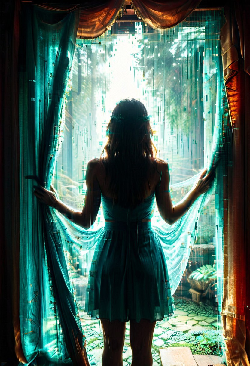 lifting the curtain to reveal the secret hidden world, <lora:SDXL_aidma_Image_Upgrader_v1:1> , professional, detailmaximizer, details, photo, realistic, max, tori , <lora:SDXL_aidmaGlitchStylev1:0.75>, lglitch, pixelated, artifacts, flickering, lady, from behind