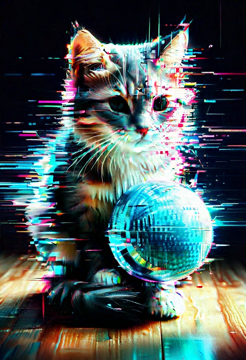 Ultrarealistic. sharp focus, dynamic lighting. play of light, reflection, refraction, Raytracing, Ultra detailed. A cute kitten made of glitch on top of a ball, glitch style, digital, flickering