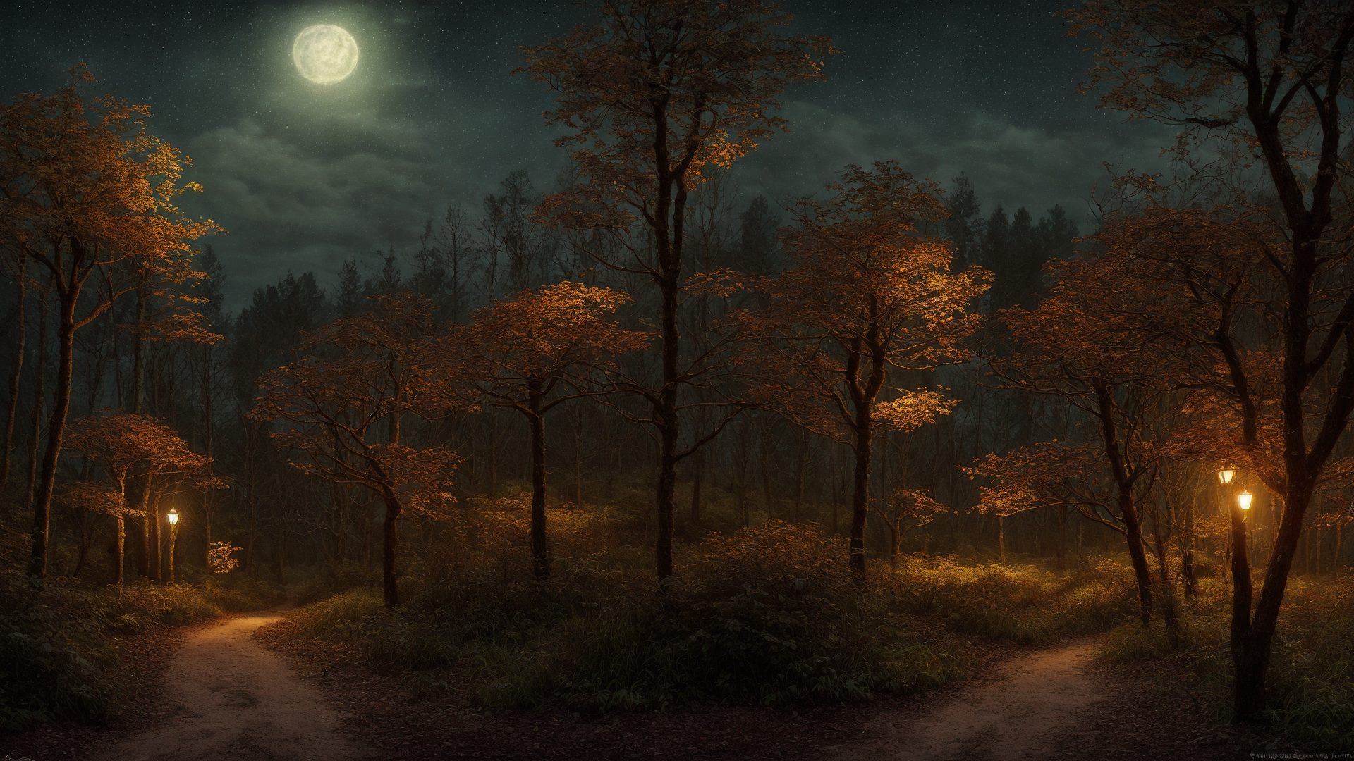 gloomy forest, spider web in the tree crowns of fir trees, beautiful night, mushrooms scattered across the glade, beautiful, extremely detailed, mystery, dark fantasy, depth of field, cold colors, realistic