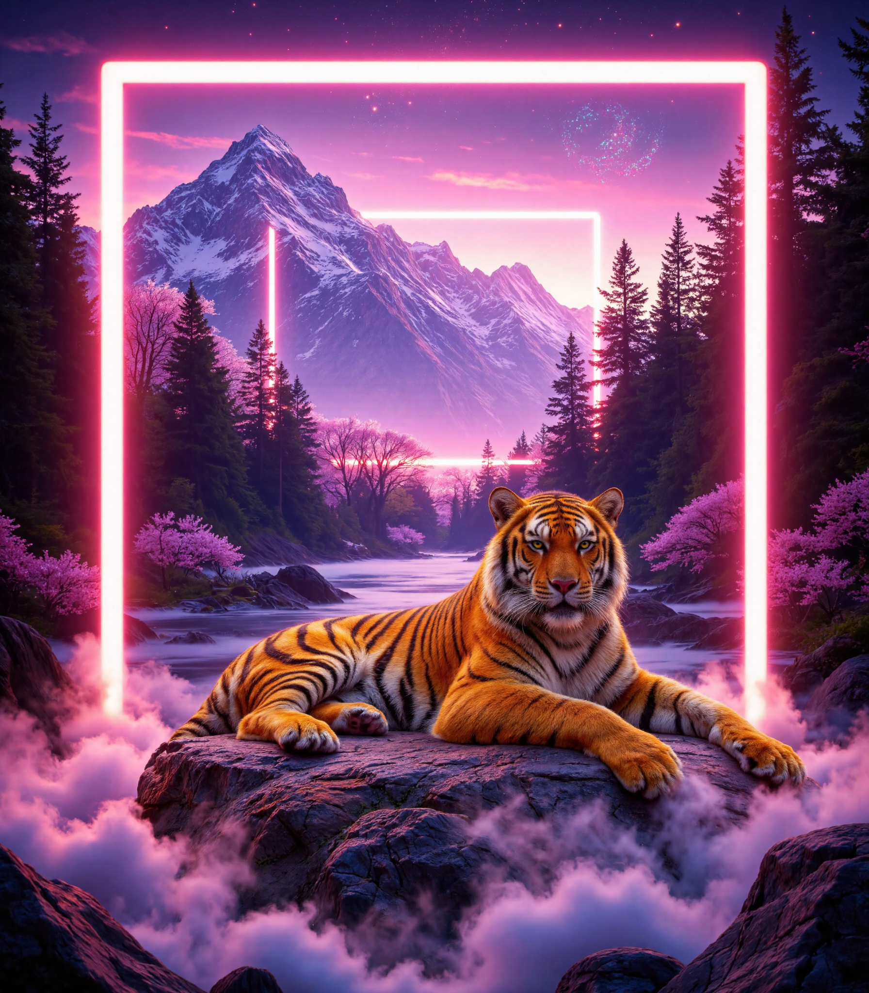 A majestic striped tiger, sleek and photorealistic, lounges powerfully on a smooth rock, its fiery orange and black coat ablaze with energy, illuminated by the radiant glow of a rectangular frame that surrounds the entire composition. The frame pulses with vibrant hues of magenta, purple, and pink, acting as a portal to a surreal fantasy world. The tiger dominates the foreground, its regal pose exuding strength and elegance as glowing particles and surreal effects swirl around it, making it the undeniable centerpiece of the scene. Inside the frame, the fantasy landscape unfolds in breathtaking detail. Towering, snow-capped mountains shimmer with faint holographic distortions, their lavender and blush peaks rising into a cosmic sky painted in gradients of pink, orange, and violet. Dense forests of deep green are interspersed with glowing, neon trees that pulse with shifting colors, and a serene lake mirrors the vibrant sky above. Ethereal cherry blossoms float gently through the air, adding a touch of tranquility to the otherworldly environment. To heighten the drama, swirling mists of glowing fog encircle the tiger, illuminated by the neon light of the frame. The fog is dynamic, catching the light in hues of magenta and violet, with faint traces of shimmering particles drifting upward like embers from a fire. A subtle glow emanates from the tiger itself, tracing its muscular form with radiant neon edges, as if it is a creature of pure light and energy. Bright streaks of light accentuate the contours of its body, blending its natural ferocity with the surreal, futuristic ambiance. The rock beneath the tiger alternates between solid reality and holographic distortion, with neon grids subtly pulsing along its surface. Water from the lake spills out of the frame, carrying glowing ripples and faint holographic distortions into the glowing margin, adding a sense of fluid motion to the composition. The tiger, perched confidently on the rock, appears to blur the boundaries between the contained world inside the frame and the limitless expanse beyond. Above and around the scene, tiny glowing particles drift through the air, occasionally breaking apart into pixelated fragments. The sky inside the frame is alive with streaking meteor-like lights and vibrant stars that flicker and distort like holograms, adding energy and depth to the overall composition. The glowing fog softens the background, drawing attention to the tiger while blending seamlessly with the neon-lit environment. Rendered in cyberpunk style, the scene combines regal poise with surreal aesthetics. Every detail—from the glowing cherry blossoms and swirling fog to the neon grids on the rock and the cosmic sky—elevates the composition into an award-winning visual masterpiece that radiates elegance, power, and immersive storytelling. aidmaExperimentalPhotography, aidmafluxproultra, aidmaimageupgrader