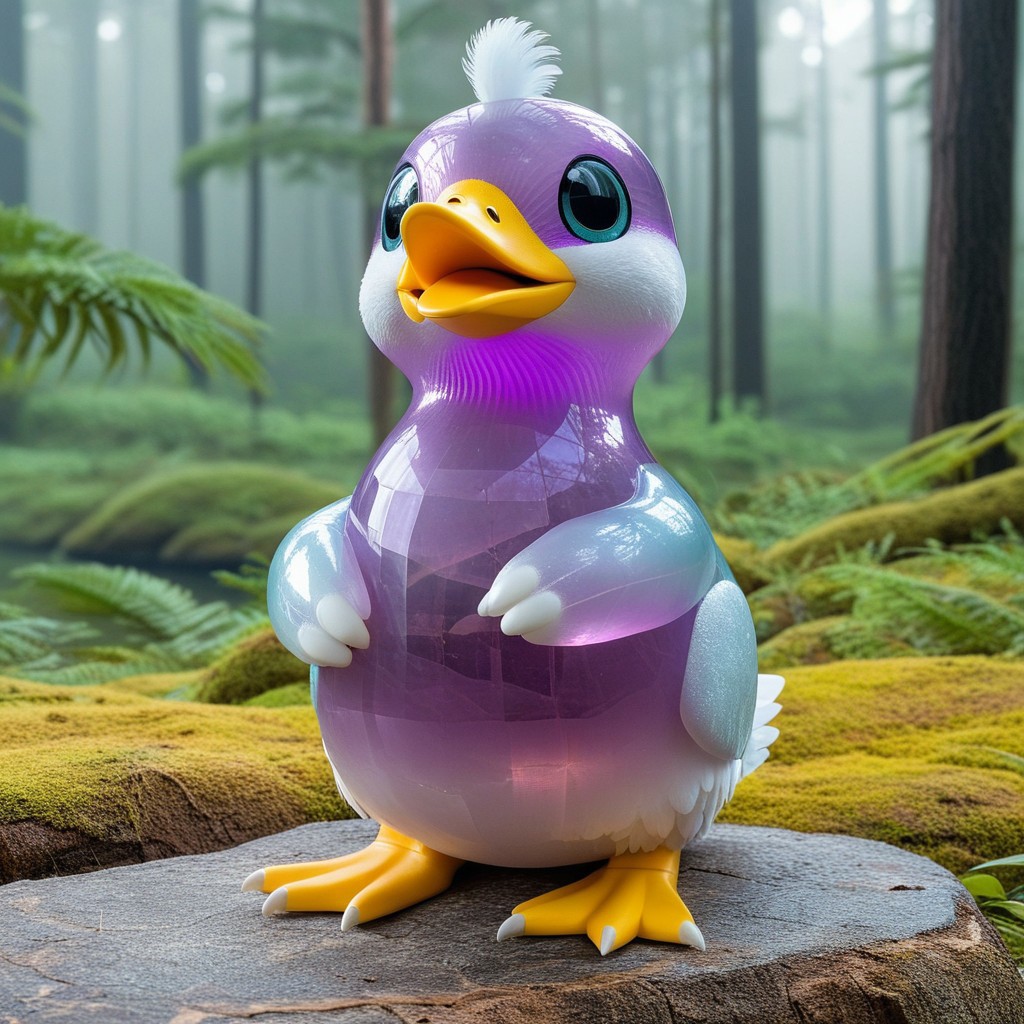 fluorite mineral, flu0rite, iridiscent, psyduck, pokemon \(creature\), no humans, solo, forest background, standing, full body, hands on own head, animal focus, bird, duck, black eyes, looking at viewer, closed mouth, arms up