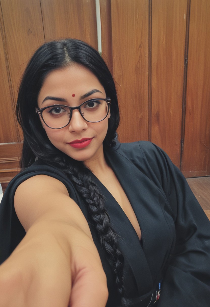 indian, 35 years old, sitting, in a courtroom, single side braided hair, dusky skin, wearing glasses, wearing advocates' black cloak and tie, full body, selfie, view from selfie, cleavage ,top view, selfie from top view, slim, big boobs, big ass, red lipstick, black eye kajal, big red bindhi , mascara