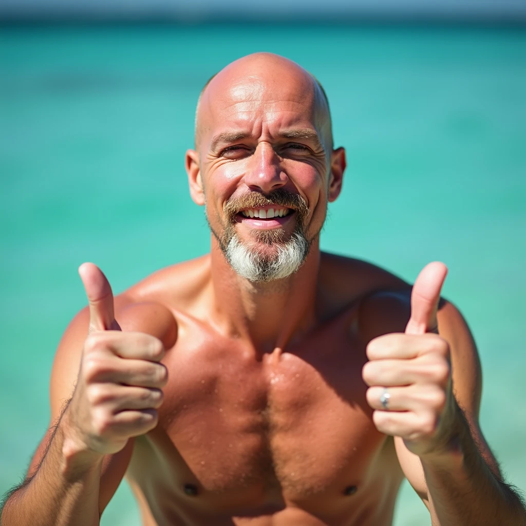 The man stands prominently, radiating confidence and a carefree demeanor, with the turquoise ocean gently rippling behind him. His posture is relaxed yet self-assured, shoulders slightly rolled back as he gives two exuberant thumbs-up. His arms are moderately toned, with a natural definition that suggests he might engage in occasional physical activity but not rigorous exercise. His hands are strong, with fingers slightly curled as he gestures, and his nails are clean, reflecting a tidy appearance. His head is entirely bald, the smooth scalp glistening faintly under the bright sunlight. The lack of hair accentuates the shape of his head, which is well-proportioned and slightly rounded at the crown. A neatly maintained goatee frames his mouth, the hair predominantly blond with streaks of silver that catch the light. This facial hair adds a mature, distinguished air to his otherwise jovial look, blending seamlessly into his lightly tanned complexion. His skin shows subtle signs of sun exposure, with a healthy glow and a faint hint of pink on his cheeks and forehead, suggesting he’s spent some time outdoors. The lines around his mouth and eyes are soft, hinting at a life of frequent smiling rather than age-induced creases. The man’s eyes are concealed behind a pair of sleek, wraparound sunglasses with dark, reflective lenses. The black frames sit snugly against his temples, contrasting sharply against his light skin. These glasses lend him an air of mystery and casual coolness, shielding his gaze while emphasizing his broad, toothy grin. His smile is inviting and genuine, revealing well-maintained teeth and a cheerful disposition. Every detail of his body language—his wide, toothy smile, his double thumbs-up gesture, his relaxed posture—conveys an unmistakable sense of joy, warmth, and confidence. This man exudes an approachable charisma, as if inviting those around him to share in his carefree enjoyment of the moment. His appearance tells the story of someone who is comfortable in his own skin, relishing the simplicity of a sunny day by the sea.