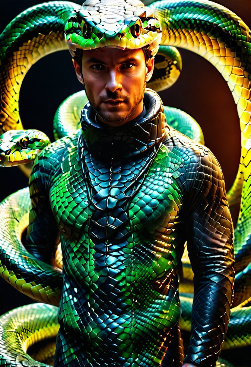 "A man wrapped by a snake around his neck, glowing under soft, eerie lighting, surrounded by discarded skin, detailed scales, surreal and unsettling atmosphere, photorealistic textures." <lora:SDXLFaeTastic2400:0.4> <lora:extremely_detailed:0.4> extremely detailed, <lora:sn4ke:1>,sn4ke, Masterpiece,best quality,hi res,8k,hi res,8k,award winning,(sharp focus, intricate, highly detailed), rating:safe