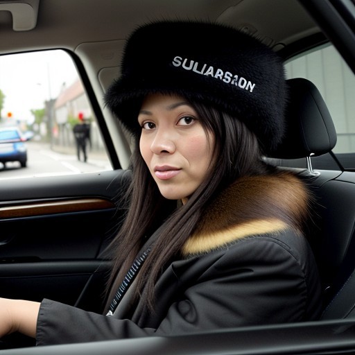 Norwegian police station chief, a sultry tall tough-as-nails sexy woman, 40 years old, long black hair, some wrinkles, pasty skin, beautiful but in a severe way, small tits, full-body view, fur hat, stopping a drunk driver and hitting him with a baton