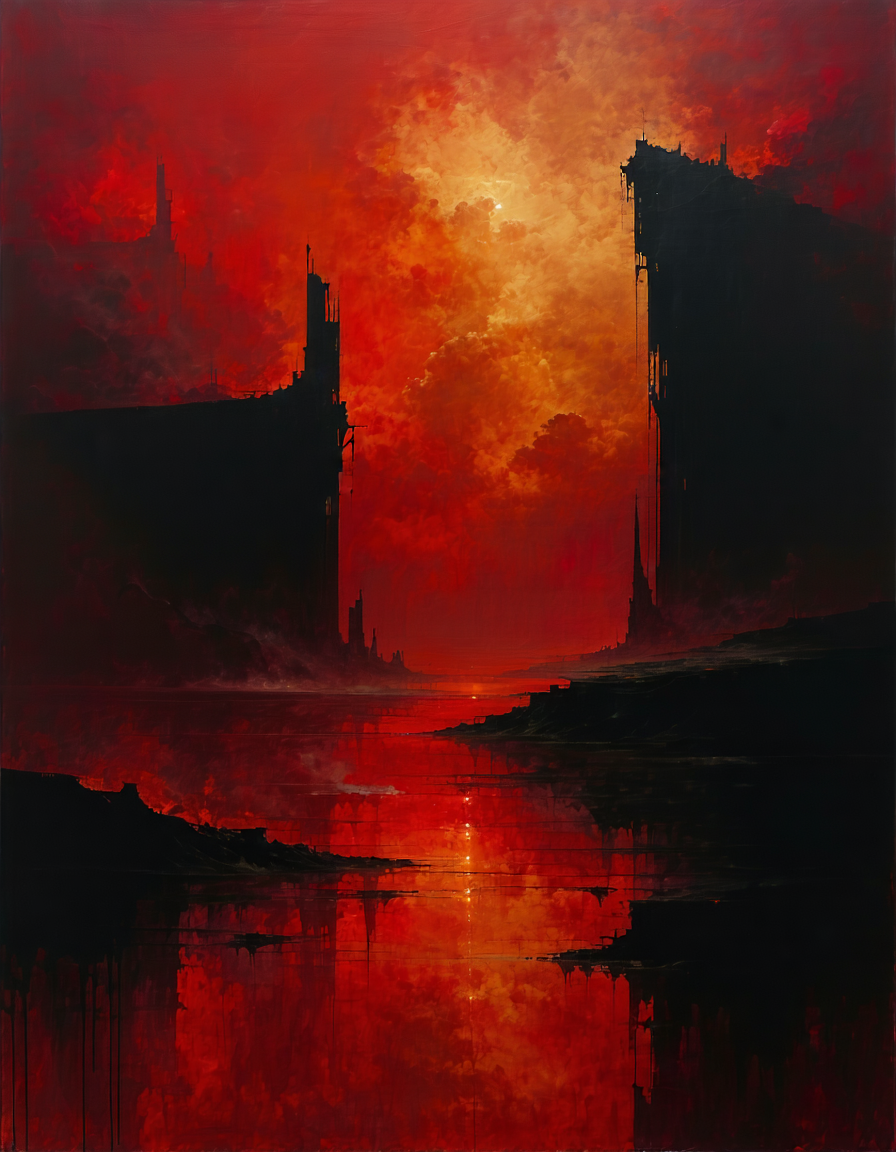 Dystopian fantasy, Beksinski, Adrian Ghenie, Mark Rothko, fog, light and shadow, muted tones