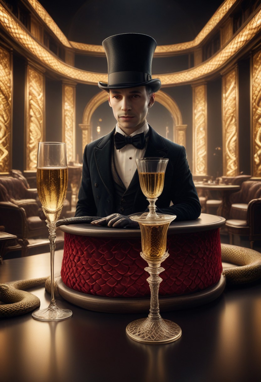 score_8_up, score_7_up, realsitic fantasy photo, solo, Still life, table, red velvet, champagne glasses, A top hat on the table, a small snake emerges from the top hat, evening lights, warm lights, details
