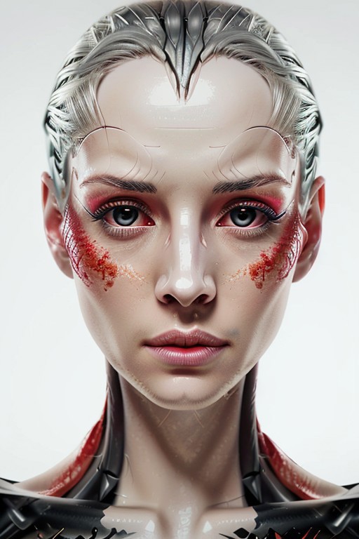 a (extreme close up) of an android with (bright red eyes iris and white hair ) and face makeup, (pale snake skin with scales) BREAK SNEKPPL, very detailed skin, italian shot, lens flare, spot lights, sharp focus, intrincate details