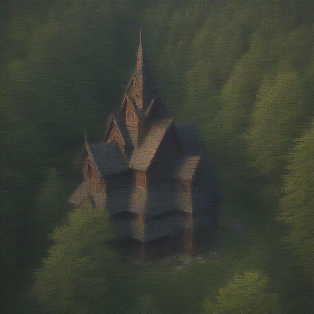 Abandoned stave church, deep in the forest, deep in the woods, dark woods, dark forest, forgotten stave church deep in the forest, tall trees, shadow, sunrise, morning, color, color, green trees,