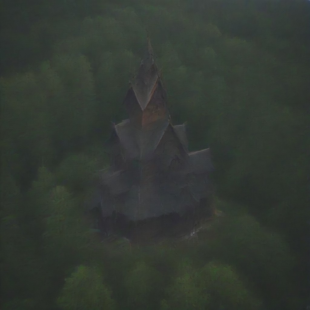 Abandoned stave church, deep in the forest, deep in the woods, dark woods, dark forest, forgotten stave church deep in the forest, tall trees, shadow, sunrise, morning, color, color, green trees,